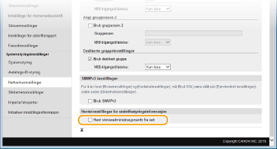 Dedikert gruppe er en forhåndsinnstilt gruppe som utelukkende er ment for administratorer som bruker Canon-programvare, som for eksempel iW Management Console. Merk av i boksen hvis du vil bruke dedikert gruppe. Fjern merket i boksen hvis du ikke trenger å bruke dedikert gruppe.