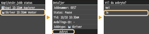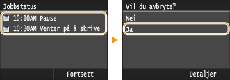 Avbryte fra FjernkontrollDu kan avbryte utskriften fra siden [Jobbstatus] i Fjernkontroll: Kontrollere gjeldende status for utskriftsdokumenter