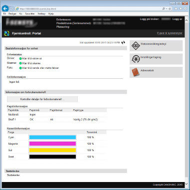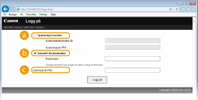 Du kan utføre alle handlinger og innstillinger i Fjernkontroll. Angi den aktuelle ID-en i [Systemadministrator-ID] og PIN-koden i [Systemstyrer-PIN] (