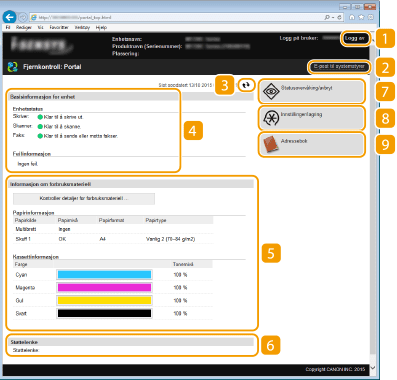 Viser gjeldende status for maskinen og feilinformasjon. Hvis det har oppstått en feil, vises en kobling til en side med feilinformasjon.