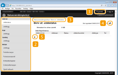 Viser statusen for de gjeldende utskrevne dokumentene og historikken over utskrevne, kopierte, sendte og mottatte dokumenter. Du kan også undersøke statusen til nettverket og maskinen.