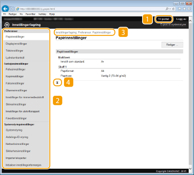 Viser siden [Innstillinger/lagring]. Når du er logget på i systemstyrermodus, kan du endre innstillingsalternativene og lagre / laste inn registrerte data.
