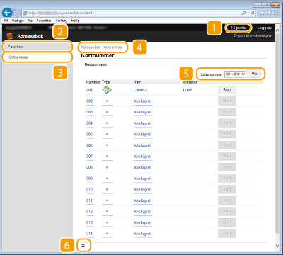 Viser kortnumrene og favorittlisten som er registrert i adresseboken. Du kan også registrere eller redigere adresseboken når du er logget på i systemstyrermodus.