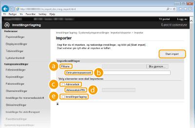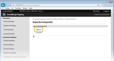 Last (importer) data som ble eksportert fra maskinen. Du kan også importere innstillinger fra en annen maskin hvis det er samme modell som din maskin.