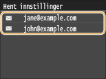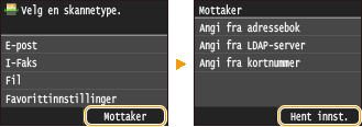 Du kan velge en mottaker blant de tre tidligere brukte mottakerne som er brukt oftest. Når du angir en tidligere brukt mottaker, angir maskinen også de samme skanneinnstillingene, for eksempel tetthet, som ble brukt forrige gang du sendte dokumenter til den mottakeren.