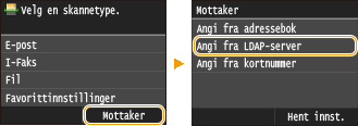 Hvis du har en LDAP-server installert på kontoret, kan du bruke mottakerne som er registrert på serveren. For å angi mottakere går du til en LDAP-server via maskinen og søker deretter etter en mottaker.