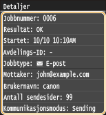 Når <Vis jobblogg> er angitt til <Av>, kan du ikke kontrollere loggene for sendte dokumenter. Vis jobblogg