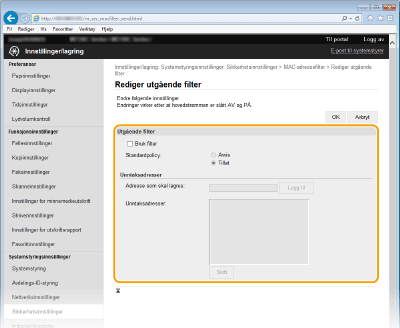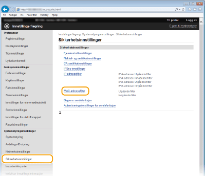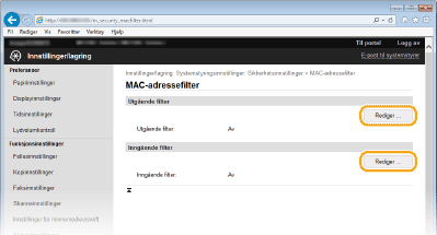 Hvis MAC-adresser blir angitt feil, kan det hende at du ikke får tilgang til maskinen fra Fjernkontroll. I så fall må du angi <MAC-adressefilter> til <Av>. MAC-adressefilter