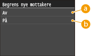Ved å begrense faksnumrene som kan angis ved sending av dokumenter, til numrene som allerede er registrert i adresseboken, tidligere brukte numre eller numre som er søkbare fra LDAP-serverne, reduserer du muligheten for å angi feil mottakere, og du unngår at det lekker informasjon fra brukerne. Når denne funksjonen er aktivert, hindrer maskinen brukere fra å angi mottakere ved hjelp av talltastene, legge til nye oppføringer i adresseboken og redigere de eksisterende oppføringene i adresseboken.