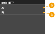 HTTP brukes for kommunikasjon over nettverket, for eksempel ved tilgang til maskinen via Fjernkontroll. Hvis du bruker en USB-tilkobling eller ellers ikke bruker HTTP, kan du deaktivere HTTP for å blokkere inntrengning fra tredjeparter via den ubrukte HTTP-porten.