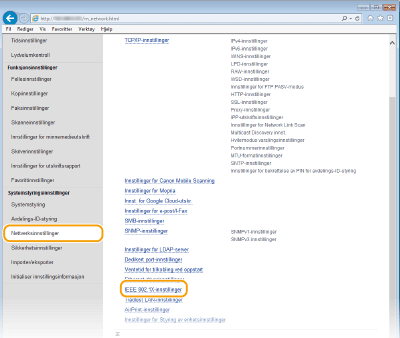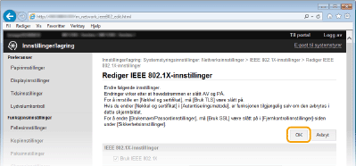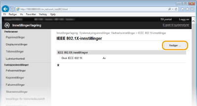 Maskinen kan kobles til et 802.1X-nettverk som en klientenhet. Et vanlig 802.1X-nettverk består av en RADIUS-server (godkjenningsserver), LAN-bryter (godkjenner) og klientenheter med godkjenningsprogramvare (leverandører). Hvis en enhet prøver å koble seg til 802.1X-nettverket, må enheten gå gjennom brukergodkjenning for å bevise at tilkoblingen blir foretatt av en godkjent bruker. Godkjenningsinformasjon sendes til og sjekkes av en RADIUS-server, som tillater eller avviser kommunikasjon med nettverket, alt etter godkjenningsresultatet. Hvis godkjenningen mislykkes, blokkerer en LAN-bryter (eller et tilgangspunkt) tilgang fra utenfor nettverket.
