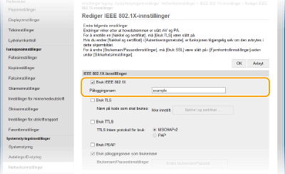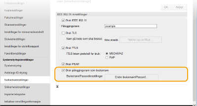 Merk av for [Bruk IEEE 802.1X], skriv inn påloggingsnavnet i tekstboksen [Påloggingsnavn], og angi de obligatoriske innstillingene.