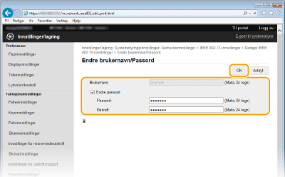 [Endre passord] Hvis du vil angi eller endre passordet, krysser du av i boksen og taster inn opptil 24 alfanumeriske tegn for det nye passordet både i tekstboksen [Passord] og i tekstboksen [Bekreft].
