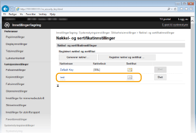Et nøkkelpar kan ikke slettes hvis det er i bruk til et formål, for eksempel når "[SSL]" eller "[IEEE 802.1X]" vises under [Nøkkelbruk]. Hvis dette er tilfelle, må du deaktivere funksjonen eller erstatte nøkkelparet før du sletter det.