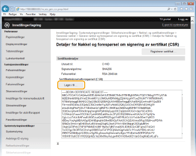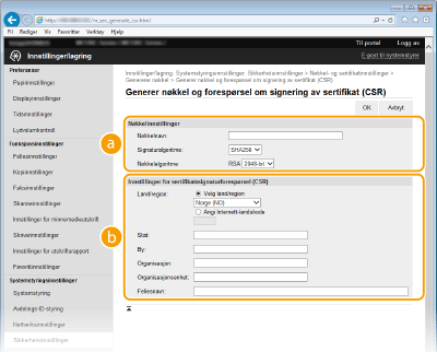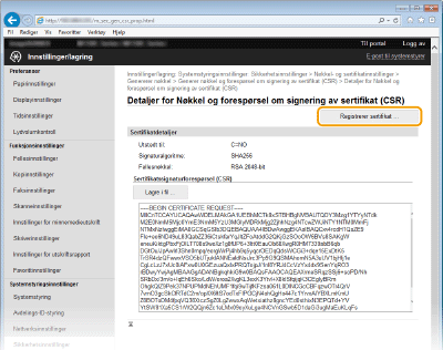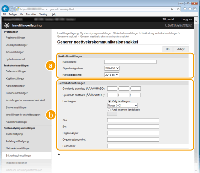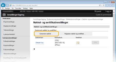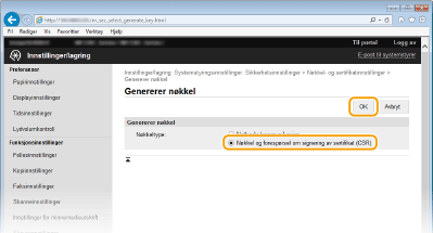 Et nøkkelpar kan genereres med maskinen når det er nødvendig for kryptert kommunikasjon via Secure Sockets Layer (SSL). Du kan bruke SSL når du har tilgang til maskinen via Fjernkontroll. Opptil fire nøkkelpar kan registreres på maskinen. Egensignerte sertifikater brukes med nøkkelpar generert i "Nettverkskommunikasjon". Med en "Nøkkel og forespørsel om signering av sertifikat (CSR)" kan du søke om et CA-utstedt digitalt sertifikat for nøkkelparet generert av maskinen.