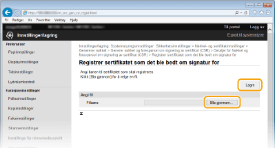 Klikk på [Browse] (Bla gjennom), angi filen for forespørselen om signering av sertifikat, og klikk på [Lagre].