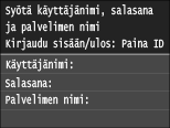 LDAP-palvelimen todennus ) on käytössä, valtuutetun lähetyksen sisäänkirjautumisnäyttö näytetään, kun faksaus- tai skannaustoimintoa käytetään.