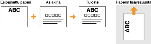 Tässä osassa kuvataan pääasiassa, miten esipainettu paperi lisätään oikein päin ja oikeassa suunnassa. Kuvaus yleisistä toimista, jotka on tehtävä lisättäessä paperia paperikasettiin tai käsinsyöttöaukkoon, löytyy kohdista Paperin lisääminen paperikasettiin ja Paperin lisääminen käsinsyöttöaukosta.