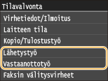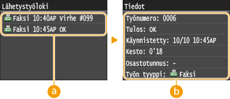 ![]() <Lähetystyöloki>/<Vastaanottotyöloki>Näyttää luettelon lähetetyistä ja vastaanotetuista asiakirjoista. <OK> näytetään, kun asiakirjan lähetys tai vastaanotto onnistui, ja <Virhe>, kun asiakirjan lähetys tai vastaanotto epäonnistui, koska se peruutettiin tai tapahtui virhe.