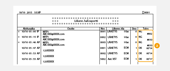 Voit tarkistaa lähetettyjen ja vastaanotettujen faksi- ja sähköpostiasiakirjojen lokit tulostamalla liikennöinnin hallintaraportin. Raportti voidaan tulostaa automaattisesti aina 40 tapahtuman jälkeen tai voit tulostaa sen manuaalisesti.