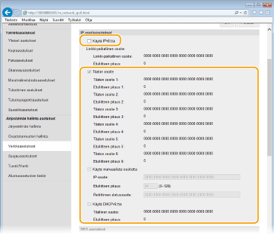 Laitteen IPv6-osoitteet voidaan määrittää etäkäyttöliittymän avulla. Tarkista IPv4-osoiteasetukset ennen IPv6-osoitteiden asettamista (IPv4-asetusten näyttäminen). Sinun on asetettava oikeat IPv4-asetukset, että voit käyttää IPv6-osoitteita. Huomaa, että skannaustoiminto, joka käyttää skanneriajuria tai MF Scan Utility -ohjelmaa, ei ole käytettävissä IPv6-ympäristössä. Laite voi käyttää enintään yhdeksää seuraavista IPv6-osoitteista: