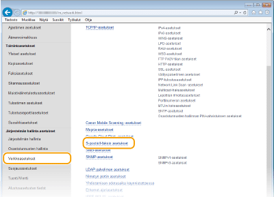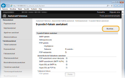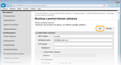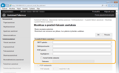 Käytetystä verkosta riippuen SMTP- tai POP3-porttiasetus täytyy ehkä muuttaa ( Porttinumeroiden muuttaminen). Lisätietoja saat Internet-palveluntarjoajaltasi tai verkon pääkäyttäjältä.