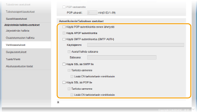 Merkitse tämä valintaruutu, kun haluat käyttää SSL-salausta tiedonsiirrossa POP-palvelimen kanssa. Merkitse valintaruudut [Tarkista varmenne] ja [Lisää CN tarkistettaviin nimikkeisiin] tarvittaessa.