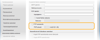 Tämä asettaa käytettävän aikavälin (minuutteina), jota käytetään POP3-pavelimen automaattiseen yhdistämiseen. Jos palvelimella on yhtään I-faksiasiakirjaa, ne vastaanotetaan ja tulostetaan automaattisesti.