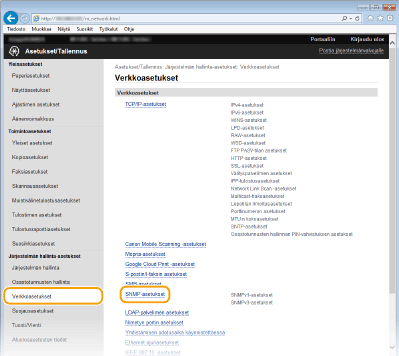 Voit ottaa SNMP-asetukset käyttöön tai poistaa ne käytöstä kohdassa <Valikko>. SNMP-asetukset