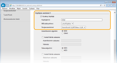 Määritä tai vaihda salasana valitsemalla valintaruutu ja syöttämällä 6–16 aakkosnumeerista merkkiä salasanaksi [Autentikoinnin salasana] tai kenttään [Salauksen salasana]. Vahvista syöttämällä sama salasana kenttään [Vahvista]. Todennus- ja salausalgoritmien salasanat voi asettaa erikseen.