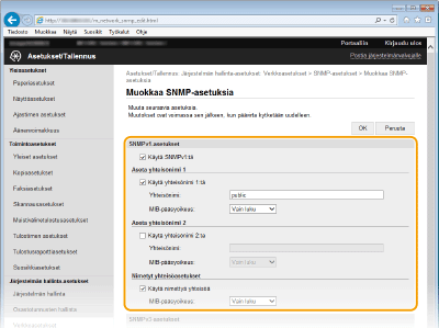 SNMP (Simple Network Management Protocol) on protokolla, jolla valvotaan ja ohjataan verkon tiedonsiirtolaitteita käyttämällä MIB:tä (Management Information Base). Laite tukee SNMPv1-protokollaa ja edistyneemmän suojauksen SNMPv3-protokollaa. Voit tarkistaa laitteen tilan tietokoneesta, kun tulostat asiakirjoja tai käytät Etäkäyttöliittymää. Voit ottaa käyttöön SNMPv1:n, SNMPv3:n tai molemmat samanaikaisesti. Määritä kunkin version asetukset verkkoympäristöön ja käyttötarkoitukseen sopiviksi.