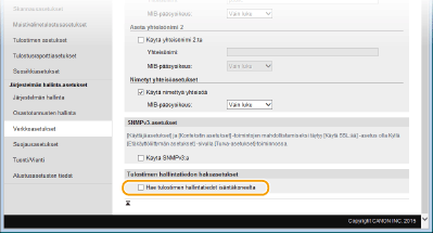 Valitse tämä valintaruutu, kun haluat ottaa käyttöön tulostimen hallintatietojen valvonnan SNMP:n kautta. Jos haluat poistaa tulostimen hallintatietojen valvonnan käytöstä, tyhjennä valintaruutu.