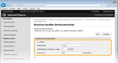 Valitse tämä valintaruutu, jos haluat, että laitehallinnan ohjelmistolle ilmoitetaan laitteen virran tila. Kun valitaan [Ilmoita], laite välttää turhaa tiedonsiirtoa lepotilan aikana ja kokonaisvirrankulutus pienenee. [Porttinumero]