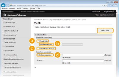 Syötä salauksen salasana enintään 32 aakkosnumeerisella merkillä. Syötä sama salasana kohdassa [Vahvista]. Salauksen salasana on asetettava tietojen vientiä varten.