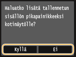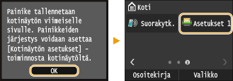 Jos valitset <Kyllä>, näyttöön tulee viesti. Tarkista viesti ja napauta <OK>. Tallennettu asetusyhdistelmä lisätään <Koti> -näyttöön pikavalintapainikkeeksi.