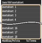 Muokkaa tai poista tallennettuja asetuksia avaamalla <Skannaus>  <Suosikkiasetukset>  <Muokkaa/Poista>  <Muokkaa> tai <Poista> ja noudattamalla sen jälkeen alla esitettäviä vaiheita. Asetuksen muokkaaminen: