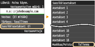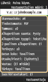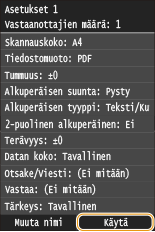 Voit rekisteröidä enintään 18 säännöllisesti käytettävää yhdistelmää skannausasetuksiin. Koska tallennetut asetukset voidaan näyttää tarpeen mukaan, monimutkaisia toimenpiteitä (esim. asiakirjan tyypin asetus, pakatun PDF-tiedoston määritys ja lähetys sisäiselle henkilökunnalle) ei tarvita jokaisella lähetyskerralla. Voit myös määritellä tallennettuja asetuksia pikavalintapainikkeiksi <Koti> -näytössä.