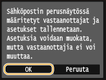 Vastaanottajia ei voi muuttaa tallentamisen jälkeen. Vastaanottajan muuttamiseksi poista asetukset ja tallenna ne uudelleen.