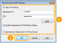 [Confirm Department ID/PIN When Printing] (Vahvista osastotunnus/PIN-koodi tulostuksen yhteydessä) / [Confirm Department ID/PIN when Sending Fax] (Vahvista osastotunnus/PIN-koodi faksin lähettämisen yhteydessä)