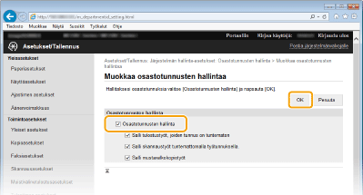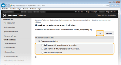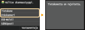 ![]() Jos [Skannaus] valintaruutu on valittu, tallennus USB-muistilaitteeseen, sähköpostin lähetys ja tallennus jaettuun kansioon tai FTP-palvelimen toiminnot ovat kaikki rajoitettuja. Voit myös rajoittaa muita asiakirjoja skannaavia menetelmiä tuomalla ne tietokoneeseesi, mutta siinä tapauksessa et voi sulkea osastotunnusten pääsyä (Töiden estäminen, kun osastotunnus on tuntematon).