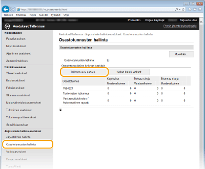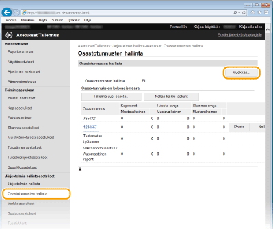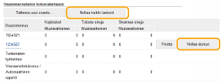[Osastotunnuksien kokonaismäärä]Voit tarkistaa kunkin osastotunnuksen kopioitujen, tulostettujen, skannattujen tai faksattujen sivujen kokonaismäärät.