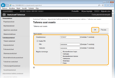 Aseta PIN-koodi valitsemalla tämä valintaruutu ja syöttämällä enintään seitsemän merkin mittainen numero kenttiin [PIN] ja [Vahvista].