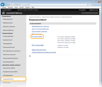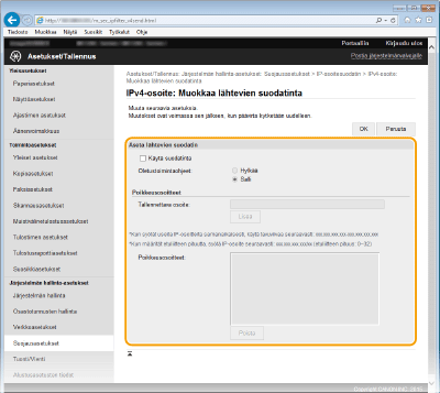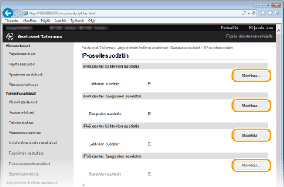 Jos IP-osoitteet on syötetty väärin, et ehkä pysty käyttämään laitetta etäkäyttöliittymästä, missä tapauksessa sinun on asetettava <IPv4-osoitesuodatin>- tai <IPv6-osoitesuodatin>-asetukseksi <Ei>. IPv4-osoitesuodatin IPv6-osoitesuodatin