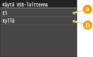 Voit poistaa laitteen takana olevan tietokoneyhteyden USB-portin käytöstä. Jos tämä portti on pois käytöstä, laite ei voi kommunikoida tietokoneen kanssa USB-yhteydellä. Tämä asetus ei vaikuta edessä olevaan USB-porttiin, jota käytetään USB-muistilaitteiden liittämiseen.