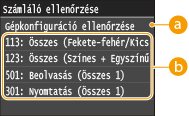 ) gomb megnyomásakor megjelenik a <Számláló ellenőrzése> képernyő. Erről a képernyőről kiindulva megtekintheti a nyomatokra vonatkozó számlálóértékeket, valamint a készülék sorozatszámát, illetve konfigurációját.