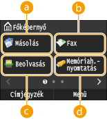 GyorsgombokJelenítse meg a Másolás, a Fax és a Beolvasás funkcióhoz bejegyzett „kedvenc beállításokat”. Gombok felvétele a <Főképernyő> képernyőre