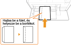 Ebből a részből megtudhatja, hogy miként tölthet be borítékokat a kívánt tájolással, valamint mit kell tennie, mielőtt a borítékokat behelyezi. A borítékok papírfiókba vagy kézi adagolónyílásba történő behelyezésének általános eljárását a következő részekben olvashatja: Papír betöltése a papírfiókba vagy Papír behelyezése a kézi adagolónyílásba.