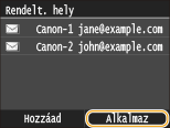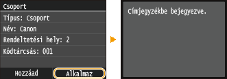 Ismételje meg a 8. és 9. lépést mindaddig, amíg minden bejegyezni kívánt rendeltetési helyet hozzá nem adott a csoporthoz, majd érintse meg az <Alkalmaz> gombot.