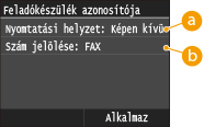 Meghatározza, hogy a küldött fax melyik pontján jelenjen meg a terminálazonosító. Ha az információt a kép területén belülre szeretné nyomtatni, akkor válassza a <Képen belül> lehetőséget, ha azon kívülre, akkor a <Képen kívül> lehetőséget.