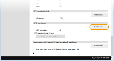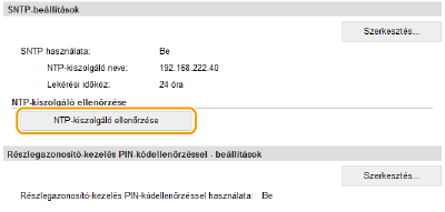 Az NTP/SNTP-kiszolgálóval folytatott kommunikáció teszteléseA bejegyzett kiszolgálóval folytatott kommunikáció állapotának megtekintéséhez kattintson a [Beállítások/Bejegyzés]